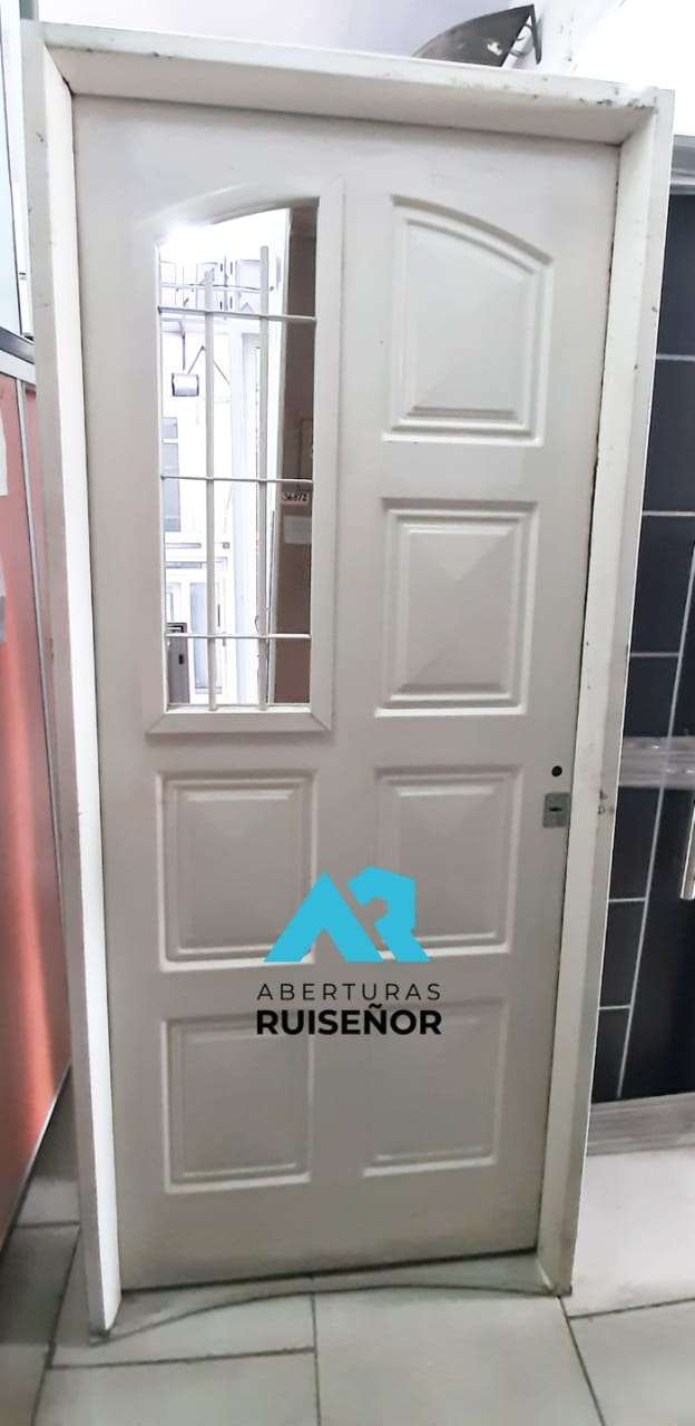Puerta Chapa simple Reforzada Reja Lateral 0.80 x 2.00 Marco en Ch 18 conformado Cerradura de Seguridad Bisagras embutidas Reja en Hierro Redondo Postigo de Abrir Puerta de diseño Clásico Muy buena calidad de construcción Disponible en portón de 3 hojas de abrir, corredizo y levadizo